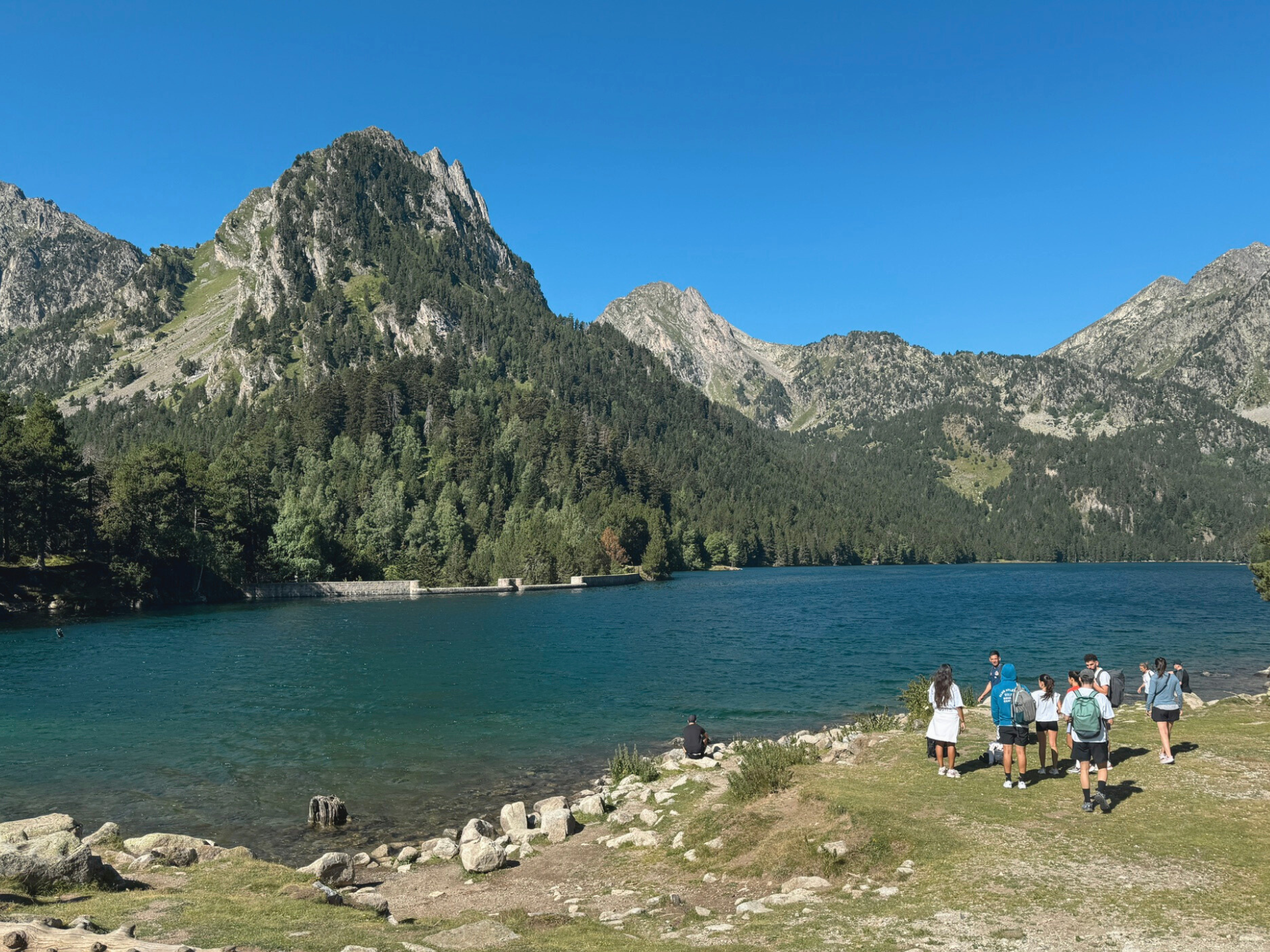 El sábado arrancamos temprano a eso de las 7.30: desayuno en el bar del camping, mate listo y al coche rumbo al parque. Dejamos el auto en el Aparcament de Prat Pierró y empezamos la subida. Acá empieza la parte más linda del finde: la caminata por el parque. Después de casi una hora llegamos al Estany de Sant Maurici pasando por la Ermita de Sant Maurici. El día estaba espectacular y, para ser agosto, no hacía tanto calor. Hicimos pausa de mate y snacks a la orilla de Sant Maurici aprovechando el rato de sol y seguimos.